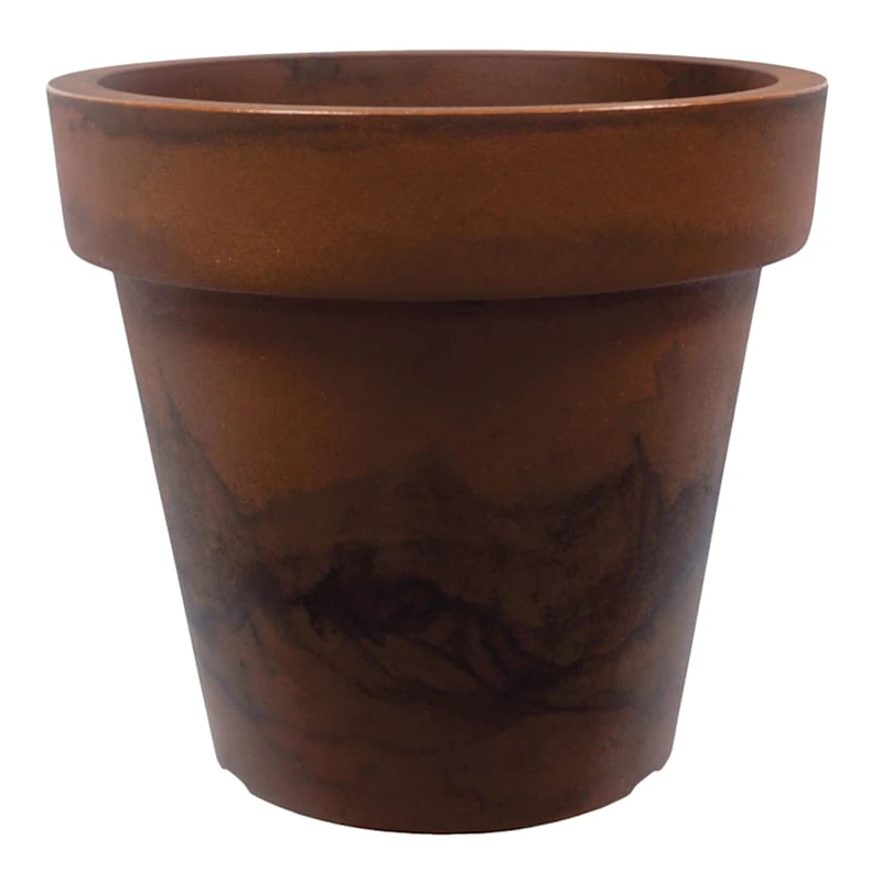 Highlight your green thumb and showcase your annuals and perennials at your front door or add a touch of festive foliage to your deck with our stylish 13x15in. all-weather polyresin rimmed planter. More than just a spot to display your gardening skills, this traditional round plastic planter has a sleek appearance with its wonderful Corten steel finish. Created to live indoors or out, it’s ready to make your plants pop.