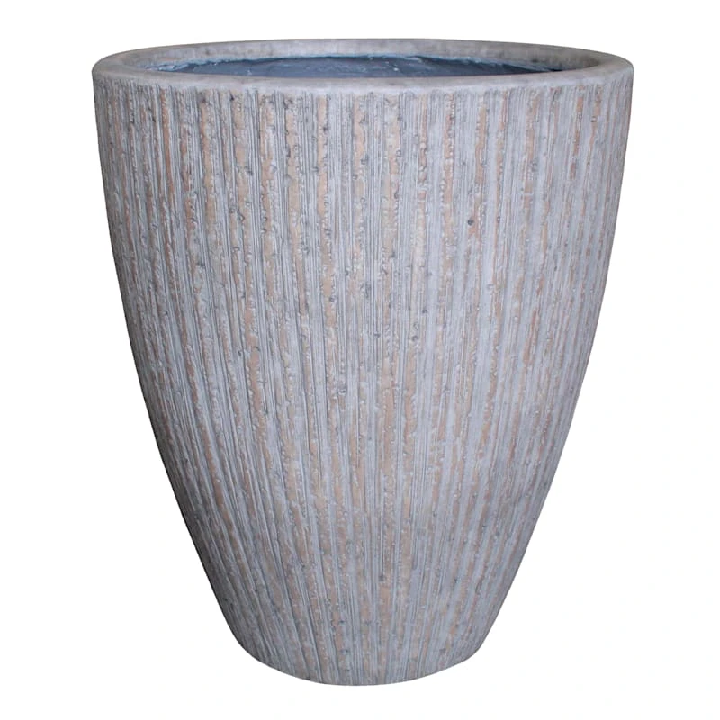 Our wonderfully textured round Bailey fossil bark design planter has a natural and grey ribbed concrete finish that makes it an amazing contemporary piece. The patina is cement that looks like fossilized bark, and it actually weighs less than it looks. Featuring a textured, realistic finish, this pot is a true statement piece. The generous 18x22in. egg-shaped size will house a good number of plants without looking crowded. Ideal for an apartment balcony, entryway or backyard patio. The modern lines and interesting shape of this planter will help maintain a clean design throughout your indoor or outdoor decor.