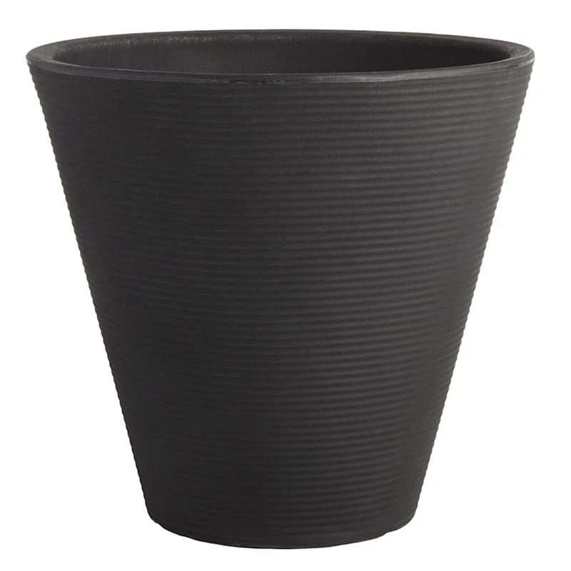 Highlight your green thumb and showcase your annuals and perennials at your front door or add a touch of festive foliage to the deck with our simple yet stylish planter. More than just a spot to display your gardening skills, this wonderful 16in. ribbed cone black pot offers a wonderful artistic appearance with its cement-look striated rib surface and cone shape. Designed to live indoors or on a covered patio, this synthetic planter is ready and waiting to make your plants pop.