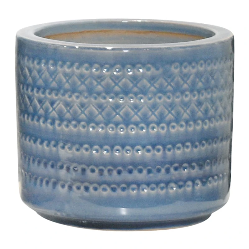 Highlight your green thumb and showcase your annuals and perennials at your front door or add a touch of festive foliage to the deck with our simple yet stylish planter. More than just a spot to display your gardening skills, this wonderful small 8in. blue tribal ceramic pot offers a wonderful artistic appearance with its dot and X-stripe design and modern cylindrical shape. Designed to live indoors or on a covered patio, this light ceramic planter is ready and waiting to make your plants pop.