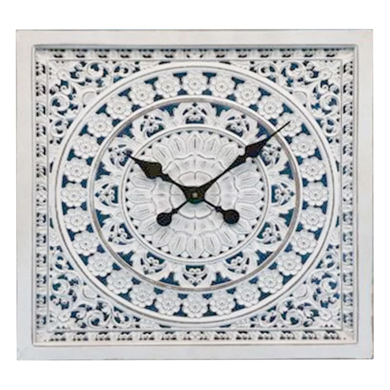 Full of simple charm, our 23.5in. carved white square wall clock combines modern reliability with timeless reliability. The whitewashed and blue fabric open carved design will look good anywhere, and the easy-to-follow hands pop to keep you on schedule!