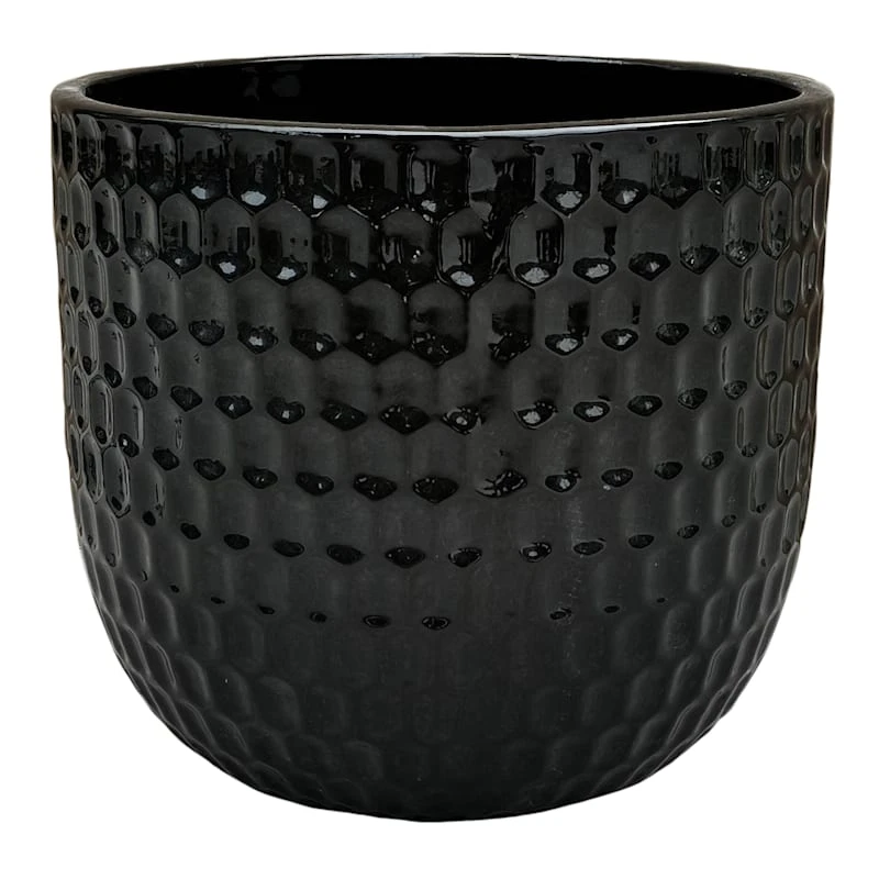 Highlight your green thumb and showcase your annuals and perennials at your front door or add a touch of festive foliage to the deck with our simple yet stylish planter. More than just a spot to display your gardening skills, this wonderful 13in. black Corey ceramic pot offers a wonderful artistic appearance with its solid shiny black surface, allover dimpling and cylindrical shape. Designed to live indoors or on a covered patio, this ceramic planter is ready and waiting to make your plants pop.