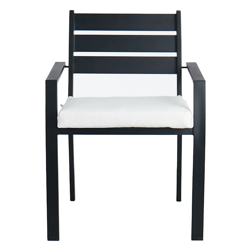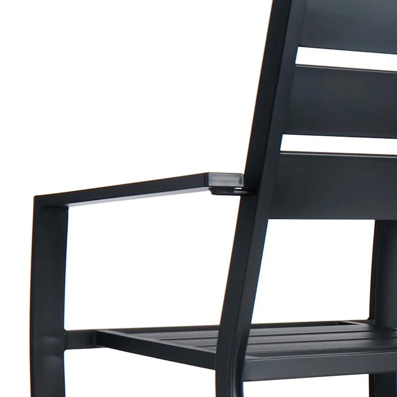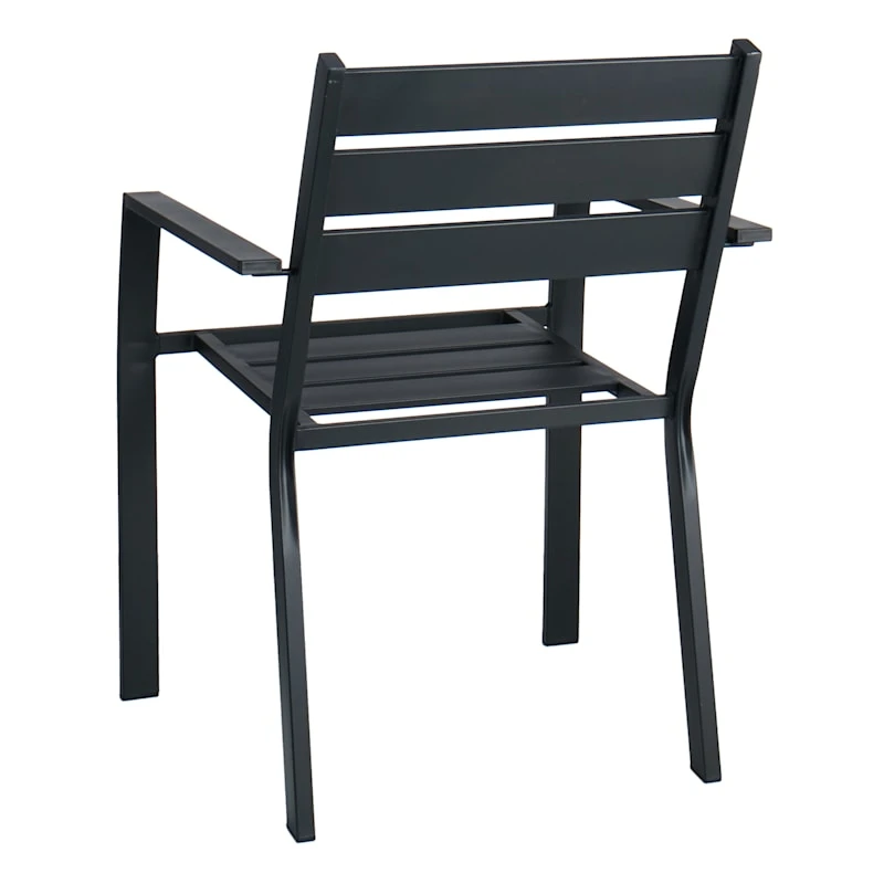 Finish out your outdoor dining arrangement or create a casual seating space with our black Grammercy steel slat outdoor chair. This chair is perfect for weathering the elements with its painted steel finish. Understated and featuring a slatted design, this chair will look great anywhere. For convenience, you can stack several when not in use.