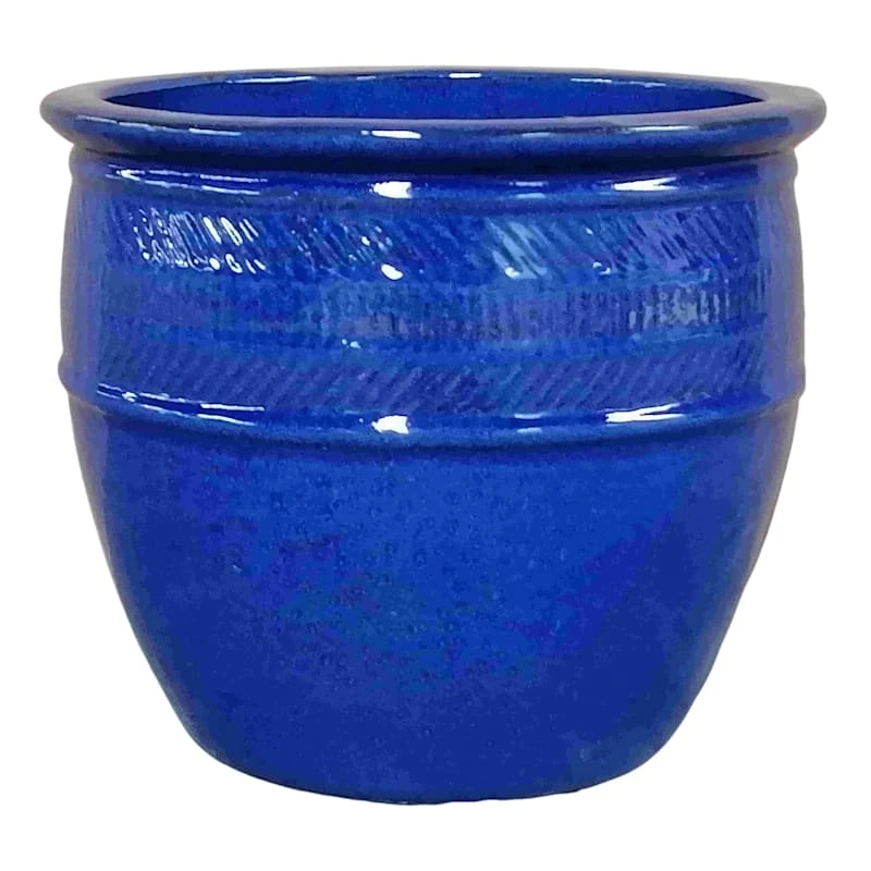 Highlight your green thumb and showcase your annuals and perennials at your front door or add a touch of festive foliage to the deck with our simple yet stylish planter. More than just a spot to display your gardening skills, this wonderful 8.5in. blue Dana ceramic planter offers a wonderful artistic appearance with its solid shiny blue surface, hashed stripe band and curved shape. Designed to live indoors or on a covered patio, this rimmed ceramic planter is ready and waiting to make your plants pop.