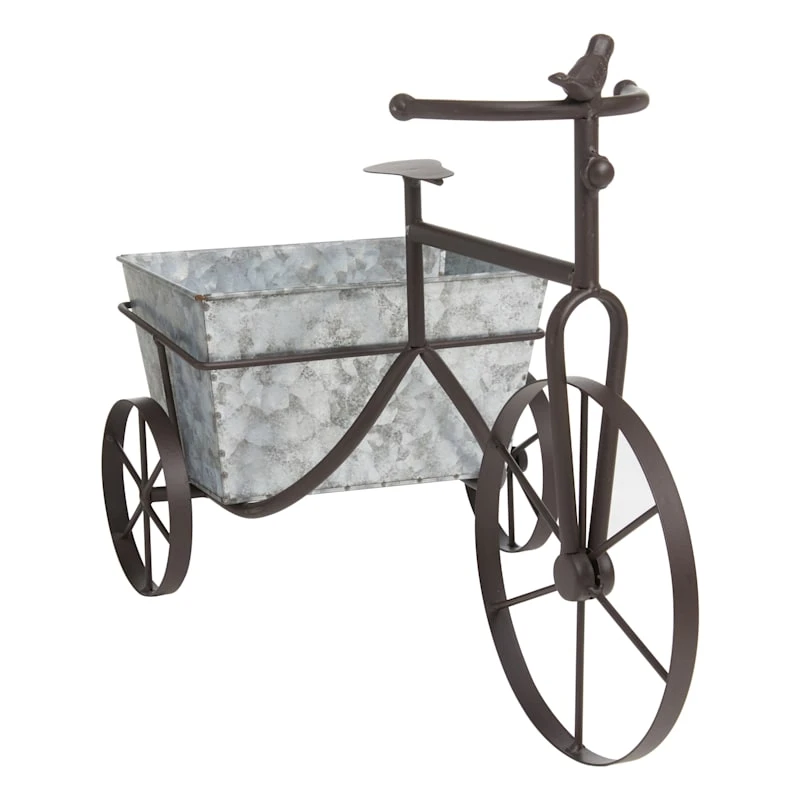 Add a touch of artistic interest to your patio plantings with our galvanized bicycle metal planter. More than just a spot to display your gardening skills, this wonderful figural planter has an old world appearance with its clever tricycle shape and interesting details. Designed to live indoors and out, it’s ready to make your plants pop.