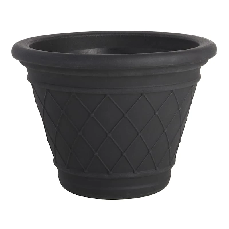 Highlight your green thumb and showcase your annuals and perennials at your front door or add a touch of festive foliage to the deck with our simple yet stylish planter. More than just a spot to display your gardening skills, this wonderful 20in. Diamante black pot offers a wonderful artistic appearance with its diamond pattern surface and curvy rimmed shape. Designed to live indoors or on a covered patio, this synthetic planter is ready and waiting to make your plants pop.