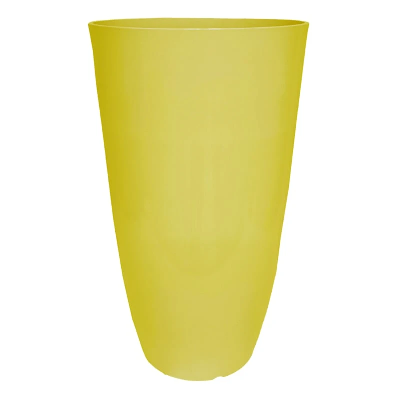 Highlight your green thumb and showcase your annuals and perennials at your front door or add a touch of festive foliage to the deck with our simple yet stylish planter. More than just a spot to display your gardening skills, this wonderful 12in. tall yellow Evelyn planter offers a wonderful artistic appearance with its simple solid surface and tall curvy cone shape. Designed to live indoors or on a covered patio, this yellow plastic pot is ready and waiting to make your plants pop.