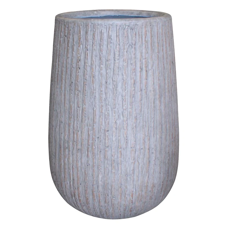 Our wonderfully textured round fossil bark design planter has a natural and grey ribbed concrete finish that makes it an amazing contemporary piece. The patina is cement that looks like fossilized bark, and it actually weighs less than it looks. Featuring a textured, realistic finish, this pot is a true statement piece. The generous 17in. size will house a good number of plants without looking crowded. Ideal for an apartment balcony, entryway or backyard patio. The modern lines and interesting shape of this planter will help maintain a clean design throughout your indoor or outdoor decor.