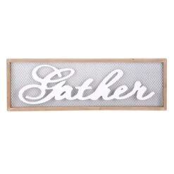 Our charming horizontal wood and wire sign features the message “Gather” carved and placed on a rustic chicken wire-look background. This wood and manufactured wood sign is finished in a natural and white hue that gives it authentic antique, old-world charm.