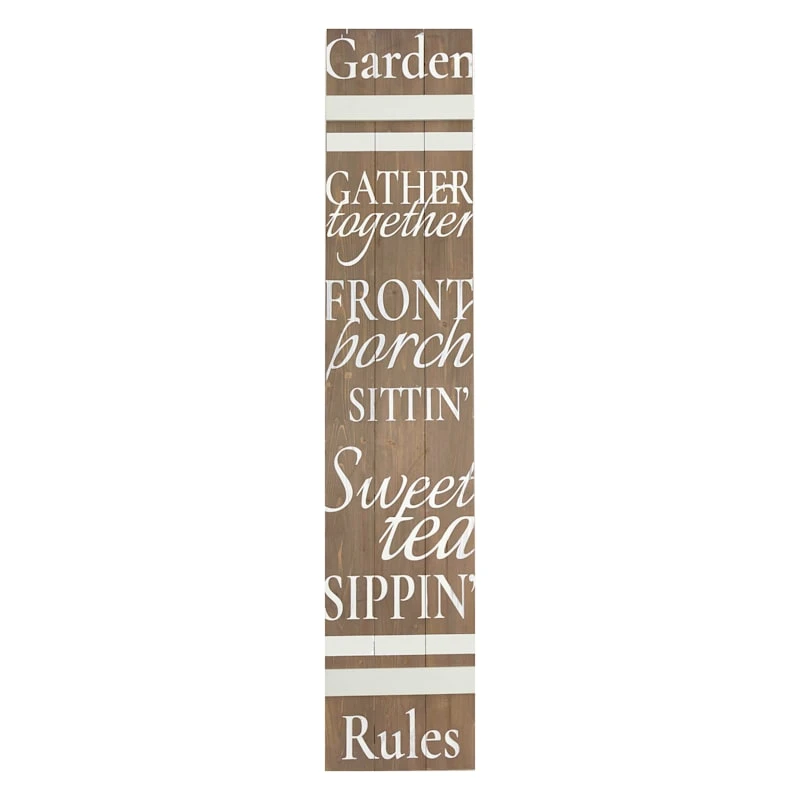Add a pinch of fun to your garden with our 12x60in. natural “Garden Rules” porch leaner sign. Created with love, this large simple hued sign features a welcoming message for all visitors. Everyone will enjoy the sweet message. Made of natural and white manufactured wood, this wall decor/ leaner is designed to greet guests all season long.