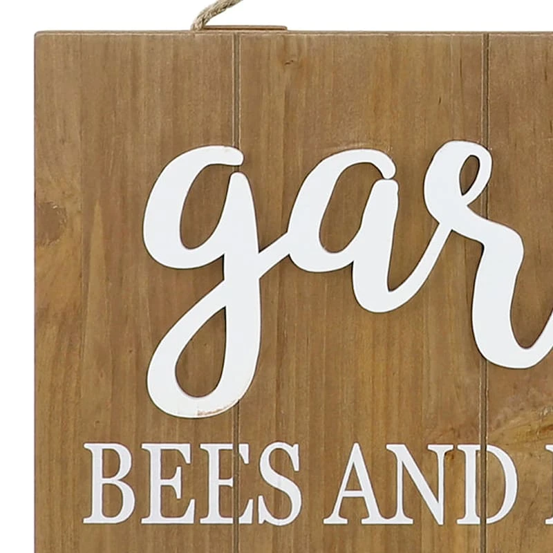 Add a pinch of fun to your garden with our 16in. “garden bees and butterflies are welcome” pallet garden wall sign. Created with love, this simple hued sign features a welcoming message list for all visitors. Everyone will enjoy the charming thought. Made of natural brown and white wood with a rope hanger, this wall decor is designed to greet guests all season long.