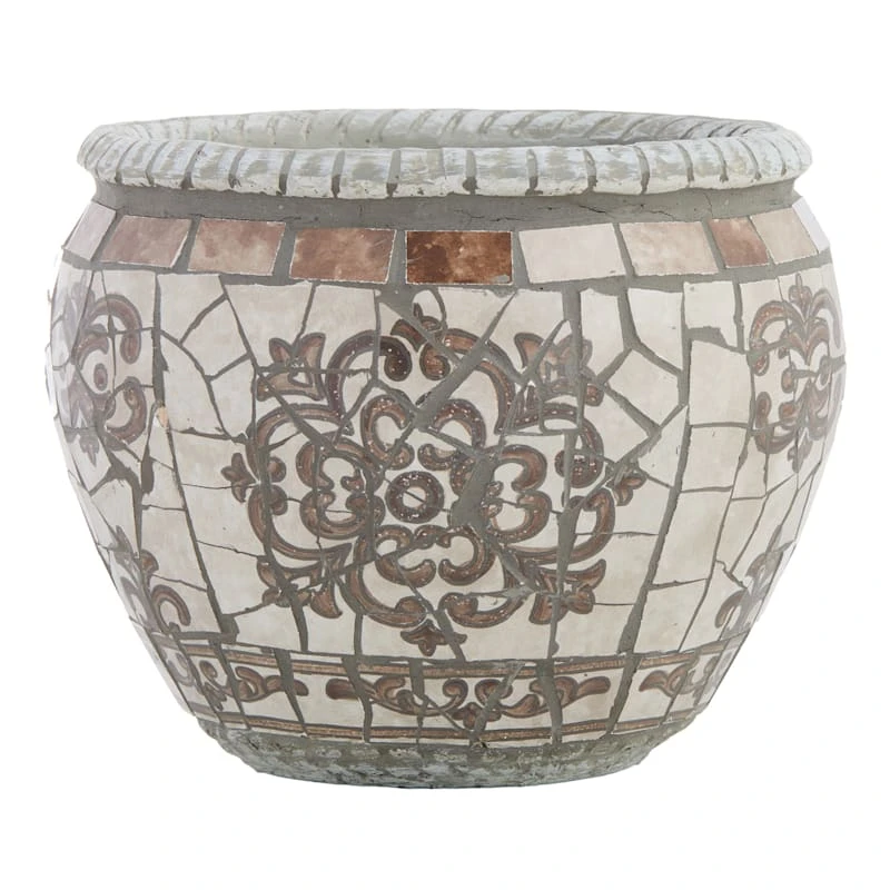 Add a touch of artistic interest to your patio plantings with our 10in. grey and white tile mosaic ceramic pot. More than just a spot to display your gardening skills, this wonderful medallion tiled planter creates a striking display with its beautiful old world details. Designed to live indoors and out, it’s ready to make your plants pop.