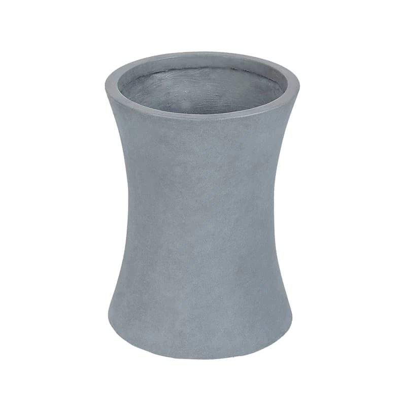 Our wonderfully textured hourglass curved clay planter has a natural grey concrete-look finish that makes it an amazing contemporary piece. The patina looks like real cement, and it actually weighs less than it looks. Featuring a smooth finish, this ceramic pot is a true statement piece. The 11x15in. size will beautifully display your favorite foliage. Ideal for an apartment balcony, entryway or backyard patio. The modern lines and interesting shape of this planter will help maintain a clean design throughout your indoor or outdoor decor.
