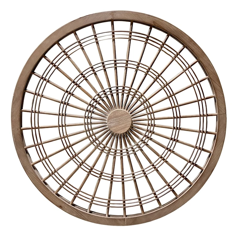 Modern farmhouse meets At Home prices in Honeybloom, our exclusive new brand that celebrates life lived together. Add a pinch of fun to your garden or patio with our 31in. natural manufactured wood framed round spoked medallion wall decor. Created with love, this simple hanging sculpture features a wonderful, rustic motif. Everyone will enjoy the sweet welcome. Made of faux wood, this wall art is designed to greet guests all season long.