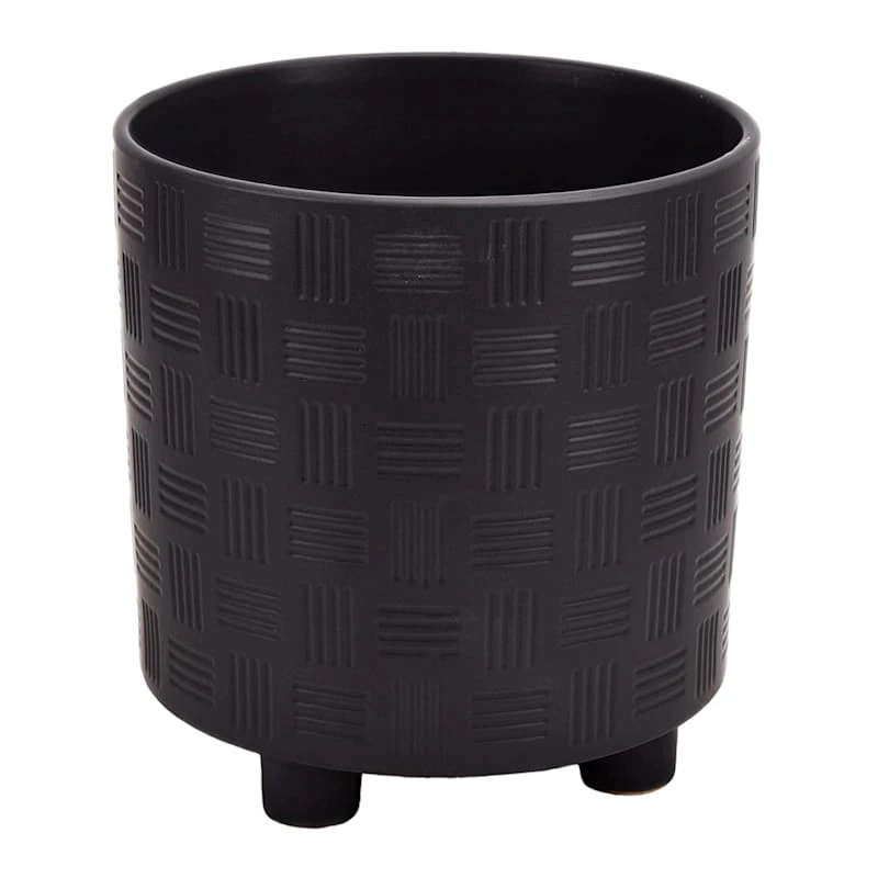 Highlight your green thumb and showcase your annuals and perennials at your front door or add a touch of festive foliage to the deck with our simple yet stylish planter. More than just a spot to display your gardening skills, this wonderful 11in. mod black footed ceramic pot offers a wonderful artistic appearance with its hashed woven look and footed base. Designed to live indoors or on a covered patio, this matte ceramic planter is ready and waiting to make your plants pop.