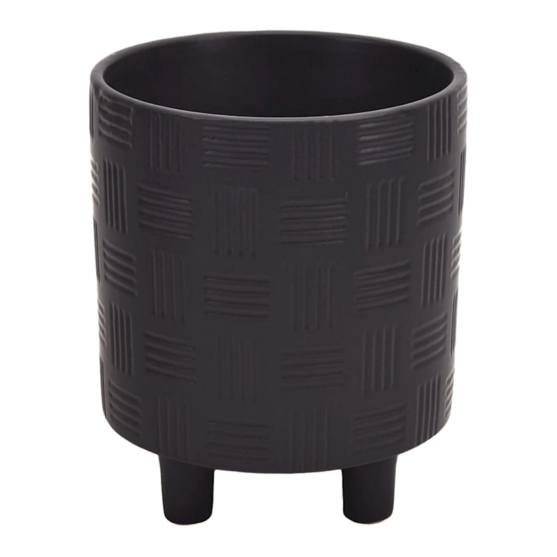 Highlight your green thumb and showcase your annuals and perennials at your front door or add a touch of festive foliage to the deck with our simple yet stylish planter. More than just a spot to display your gardening skills, this wonderful 8in. mod black footed ceramic pot offers a wonderful artistic appearance with its hashed woven look and footed base. Designed to live indoors or on a covered patio, this matte ceramic planter is ready and waiting to make your plants pop.