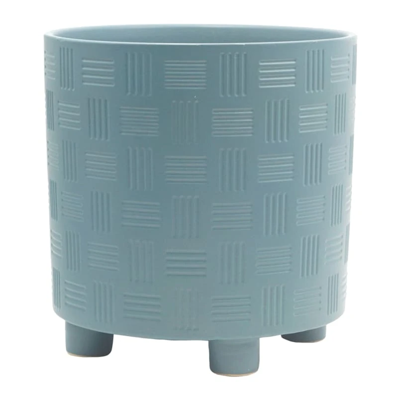 Highlight your green thumb and showcase your annuals and perennials at your front door or add a touch of festive foliage to the deck with our simple yet stylish planter. More than just a spot to display your gardening skills, this wonderful 11in. mod blue footed ceramic pot offers a wonderful artistic appearance with its hashed woven look and footed base. Designed to live indoors or on a covered patio, this matte ceramic planter is ready and waiting to make your plants pop.