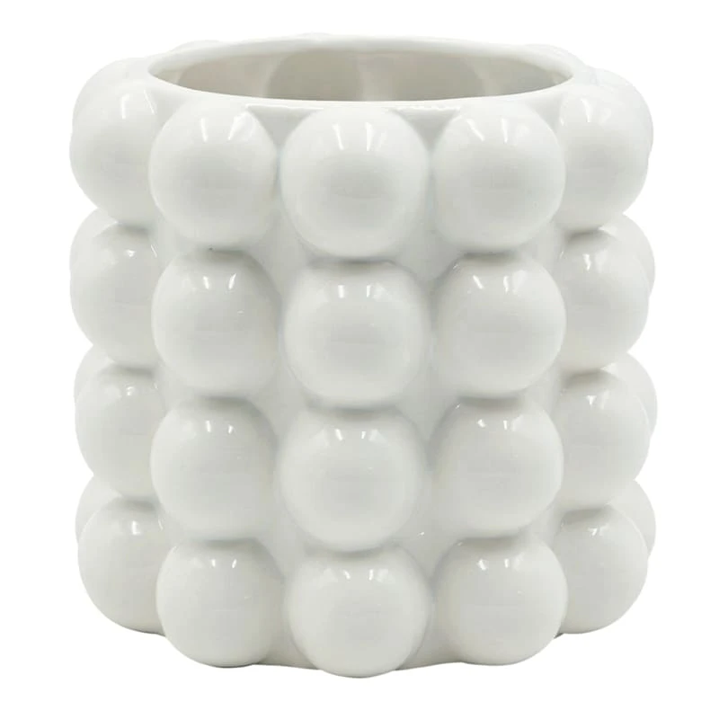 Highlight your green thumb and showcase your annuals and perennials at your front door or add a touch of festive foliage to the deck with our simple yet stylish planter. More than just a spot to display your gardening skills, this wonderful 7in. white bubble ceramic pot offers a wonderful artistic appearance with its traditional cylindrical body and large bubble surface. Designed to live indoors or on a covered patio, this ceramic planter is ready and waiting to make your plants pop.