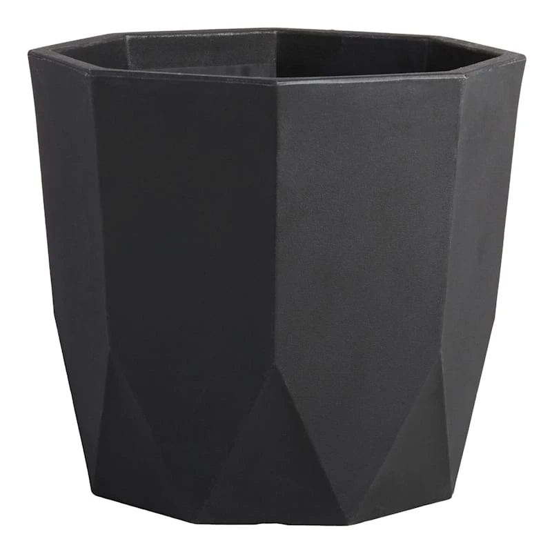 Highlight your green thumb and showcase your annuals and perennials at your front door or add a touch of festive foliage to the deck with our simple yet stylish planter. More than just a spot to display your gardening skills, this wonderful 16in. Merino black planter offers a wonderful artistic appearance with its solid matte surface and faceted shape. Designed to live indoors or on a covered patio, this synthetic planter is ready and waiting to make your plants pop.