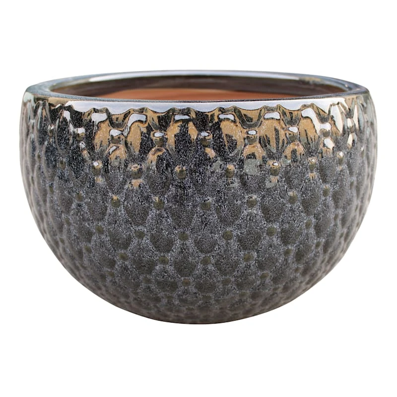 Add a touch of artistic interest to your patio plantings with our 12in. rounded Moonlight black metallic low ceramic planter. More than just a spot to display your gardening skills, this wonderful embossed pot creates a striking display with its beautiful chain-link details. Designed to live indoors and out, it’s ready to make your plants pop.