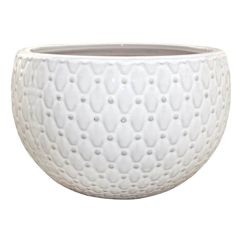 Add a touch of artistic interest to your patio plantings with our 12in. rounded Moonlight white ceramic planter. More than just a spot to display your gardening skills, this wonderful embossed pot creates a striking display with its beautiful chain-link dotted details. Designed to live indoors and out, it’s ready to make your plants pop.