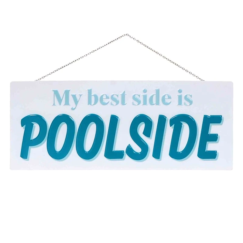 Add a pinch of fun to your garden with our 20in. blue and white “My best side is poolside” metal wall sign. Created with love, this simple plaque features a multicolor script message motif. Everyone will enjoy the sweet welcome. Made of rust-resistant metal with a chain hanger, this wall decor is designed to greet guests all season long.