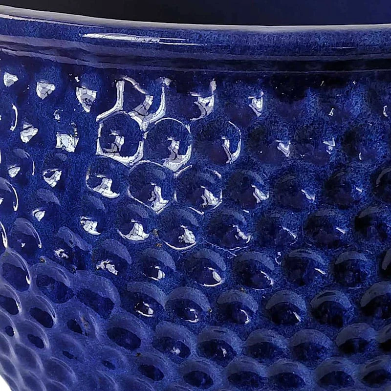 Highlight your green thumb and showcase your annuals and perennials at your front door or add a touch of festive foliage to the deck with our simple yet stylish planter. More than just a spot to display your gardening skills, this wonderful 18.5in. blue Rosalind ceramic planter offers a wonderful artistic appearance with its solid shiny dark blue surface, allover dimpling and curved rimmed shape. Designed to live indoors or on a covered patio, this ceramic planter is ready and waiting to make your plants pop.
