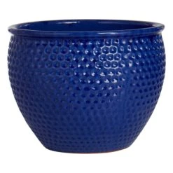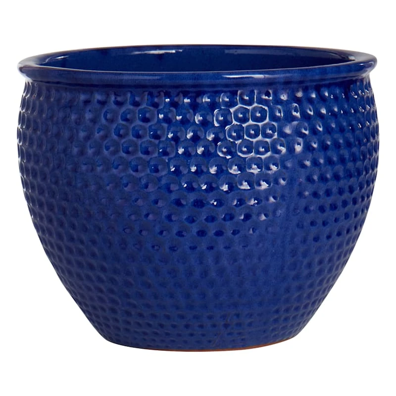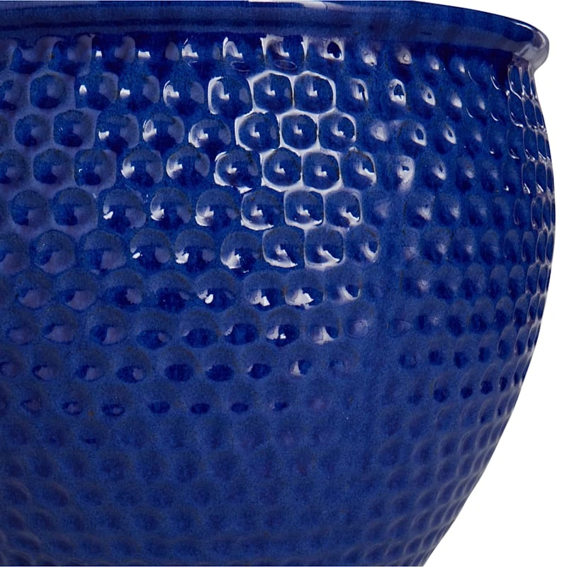 Highlight your green thumb and showcase your annuals and perennials at your front door or add a touch of festive foliage to the deck with our simple yet stylish planter. More than just a spot to display your gardening skills, this wonderful 15in. blue Rosalind ceramic planter offers a wonderful artistic appearance with its solid shiny dark blue surface, allover dimpling and curved rimmed shape. Designed to live indoors or on a covered patio, this ceramic planter is ready and waiting to make your plants pop.