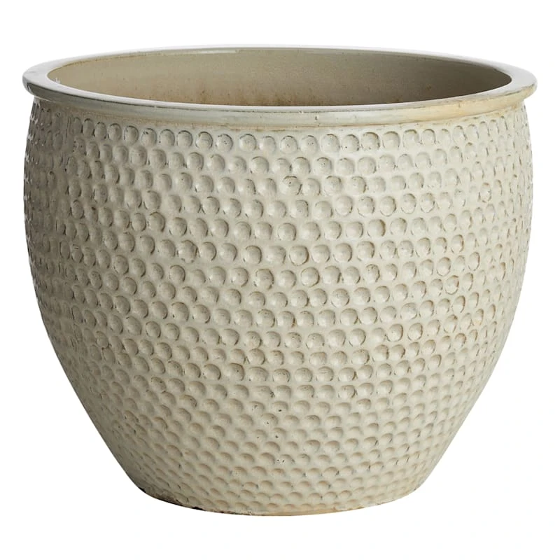 Highlight your green thumb and showcase your annuals and perennials at your front door or add a touch of festive foliage to your deck with our 19in. Rosalind cream ceramic planter. More than just a spot to display your gardening skills, this embossed allover dimpled pot has a charming appearance with its wonderful rimmed design. Created to live indoors or out, it’s ready to make your plants pop.