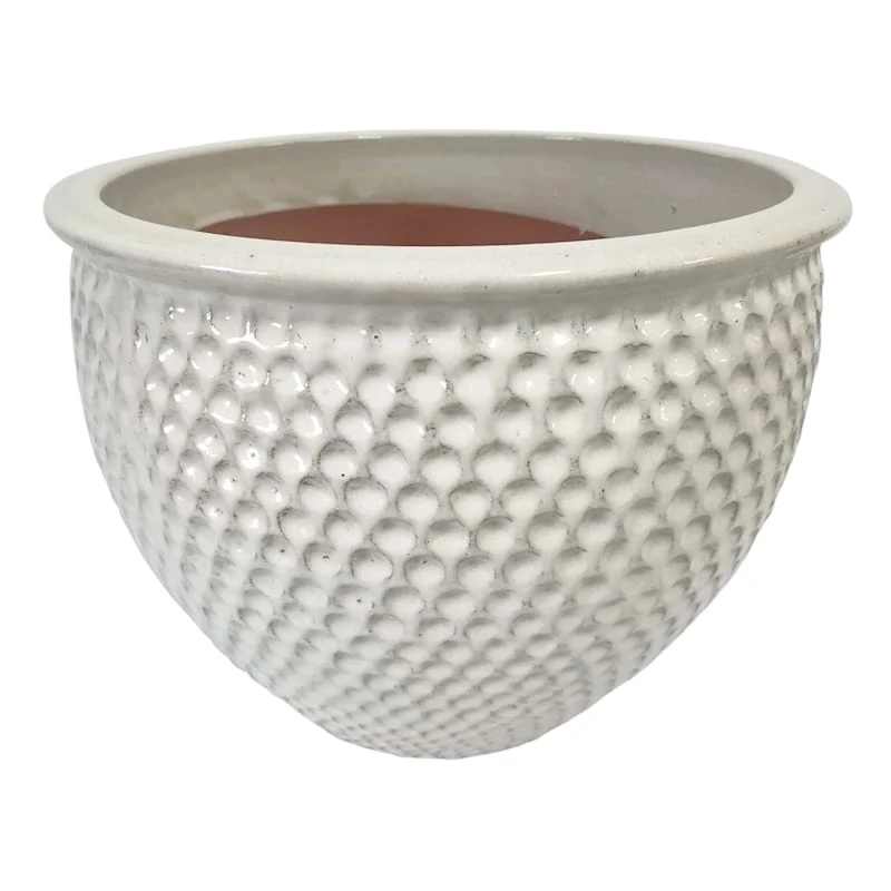Highlight your green thumb and showcase your annuals and perennials at your front door or add a touch of festive foliage to your deck with our 15in. Rosalind cream ceramic planter. More than just a spot to display your gardening skills, this embossed allover dimpled pot has a charming appearance with its wonderful rimmed design. Created to live indoors or out, it’s ready to make your plants pop.