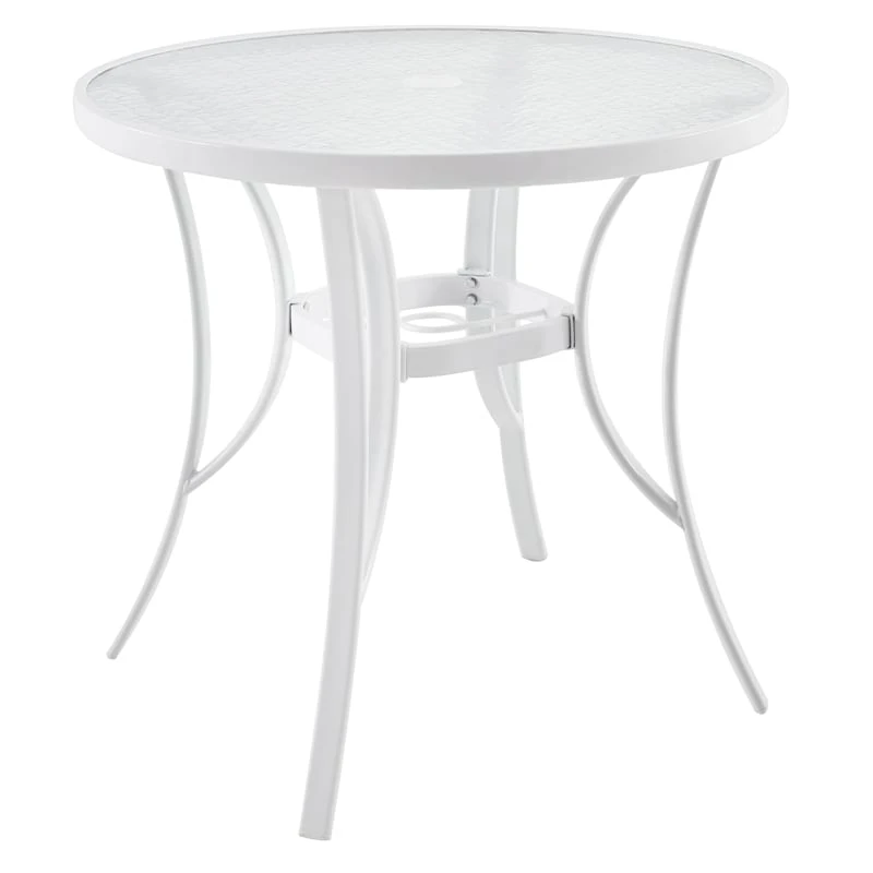 Our white steel and glass 30in. round dining table is perfect for any outdoor space. The color is neutral to complement other furniture collections. The simple traditional design is the right look for your deck, porch or garden. Sit down and enjoy a relaxing cocktail, or have a quiet meal outside. The hole in the center allows you to add an umbrella for refreshing shade. Good times ahead!