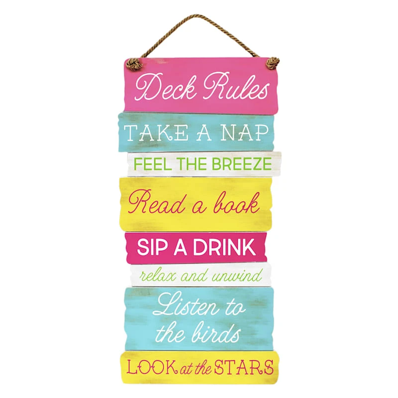 Add a pinch of fun to your garden with our 15x30in. multicolor “Summer Deck Rules” wooden wall sign. Created with love, this simple plaque features a pink, blue, white, yellow and green directional message motif. Everyone will enjoy the whimsical welcome. Made of manufactured wood with a rope hanger, this wall decor is designed to greet guests all season long.