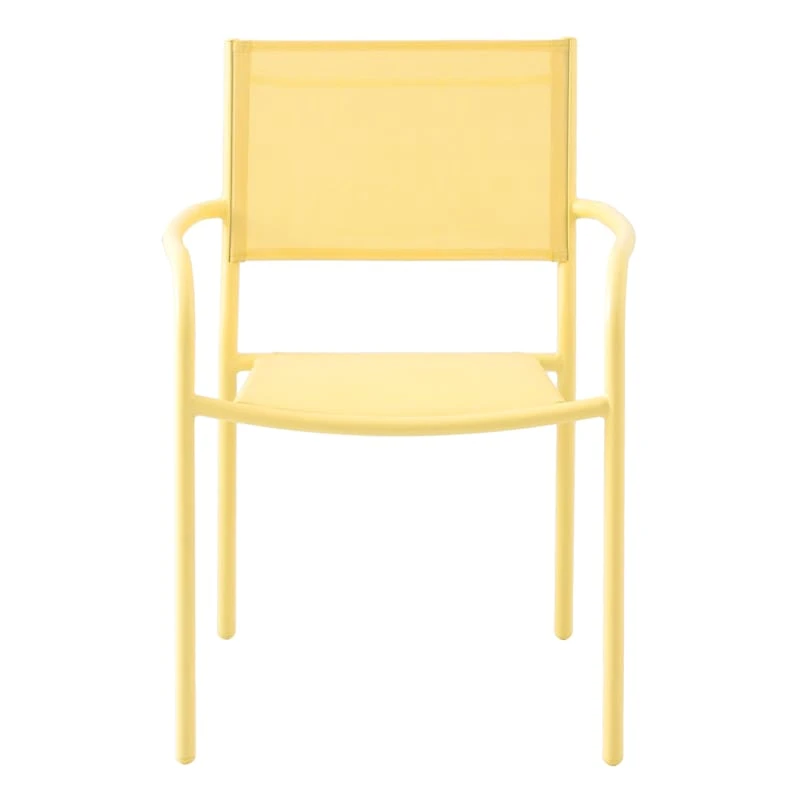 Enjoy the season and get outside with our stackable Sunny Club light yellow Textilene outdoor stackable chair. Buy in multiples and be sure to have enough outdoor seating for family and friends. This outdoor seat features a simple, streamlined look with a metal frame and a comfortable mesh fabric that’s breathable. This light yellow stacking chair will last even longer if protected from the elements. Pair with any patio table or garden stool and enjoy the great outdoors to the fullest.