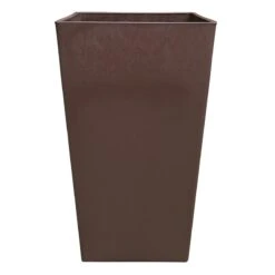 Highlight your green thumb and showcase your annuals and perennials at your front door or add a touch of festive foliage to the deck with our simple yet stylish planter. More than just a spot to display your gardening skills, this wonderful 21in. tall square smooth brown planter offers a wonderful artistic appearance with its simple solid surface and rimmed top. Designed to live indoors or on a covered patio, this plastic pot is ready and waiting to make your plants pop.