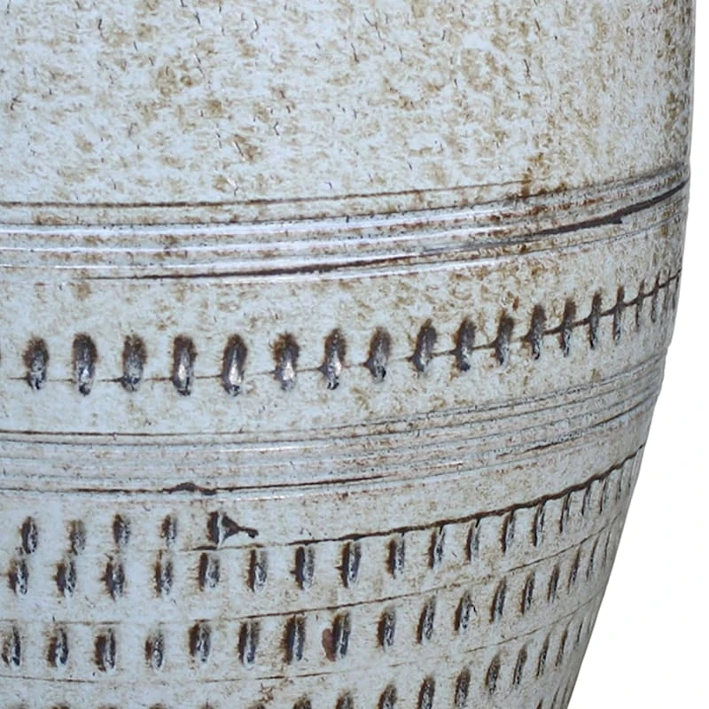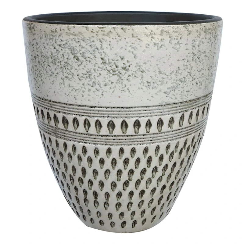 Add a touch of artistic interest to your patio plantings with our tall white Cyber ceramic pot. More than just a spot to display your gardening skills, this wonderful 12x14in. glazed planter has an interesting dotted sketch appearance with its cylindrical shape and mottled surface. Designed to live indoors or out, it’s ready to make your plants pop.