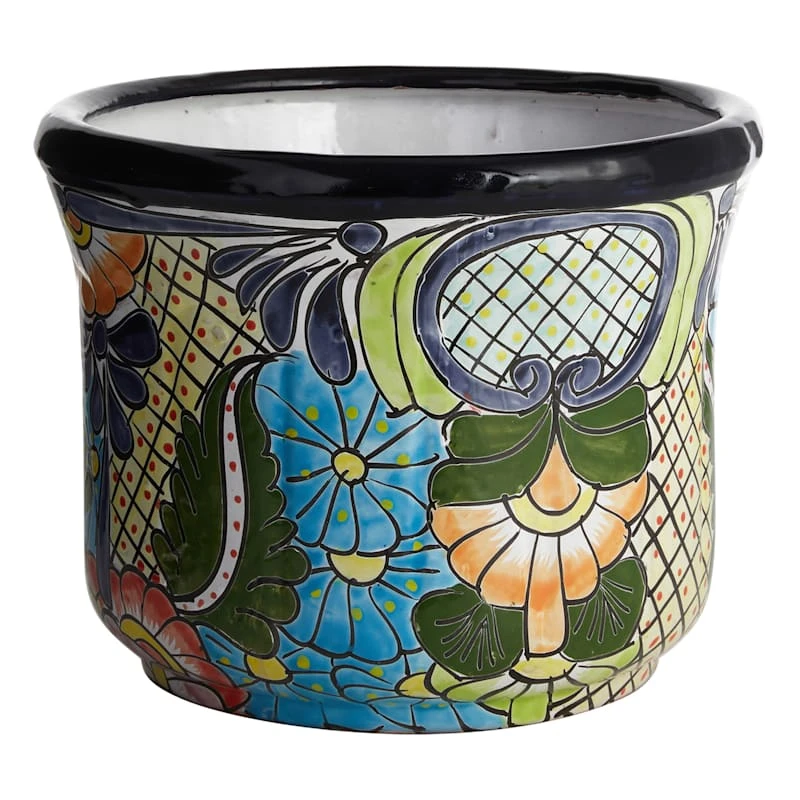 Accent any room in your house with our 13x16in. multicolor Talavera-look Tazon ceramic pot. Painted in vivid colors, our interesting planter will perfectly blend in with any type of decoration in your living room, kitchen, office or patio.