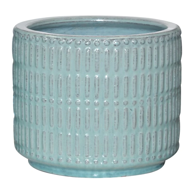 Highlight your green thumb and showcase your annuals and perennials at your front door or add a touch of festive foliage to the deck with our simple yet stylish planter. More than just a spot to display your gardening skills, this wonderful 8in. textured teal ceramic pot offers a wonderful artistic appearance with its traditional cylindrical body and separated stripe surface. Designed to live indoors or on a covered patio, this glazed ceramic planter is ready and waiting to make your plants pop.