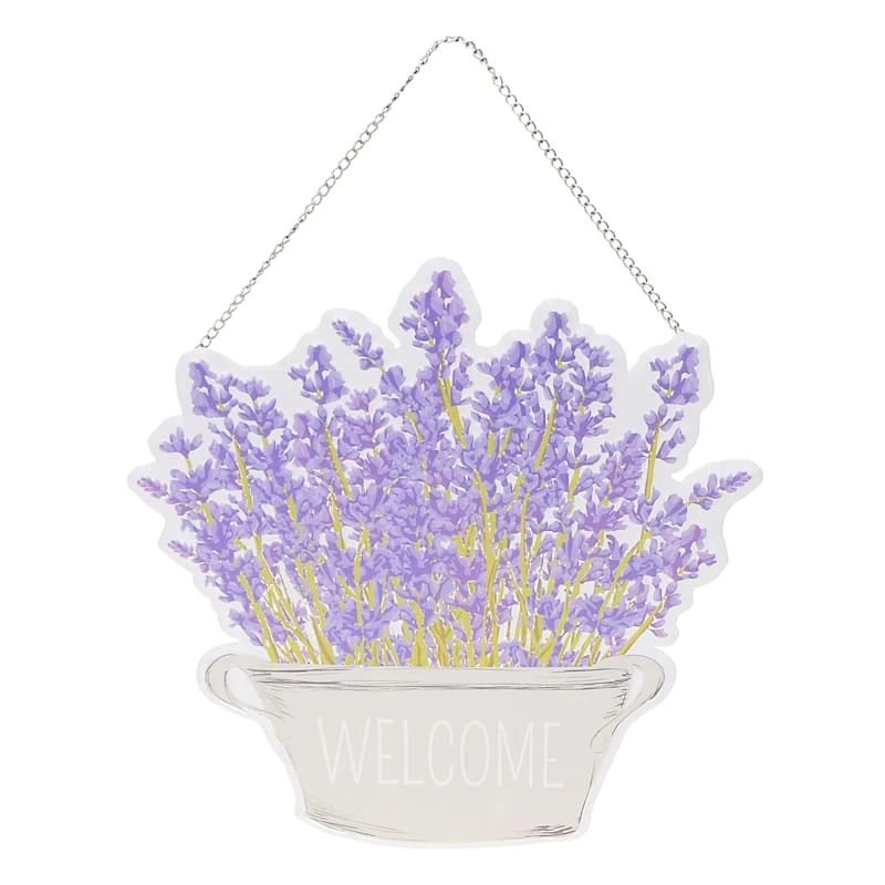 Add a pinch of fun to your garden with our 12in. multicolor “Welcome” flowers metal wall sign. Created with love, this simple plaque features a beautiful purple, natural and white lavender pot motif. Everyone will enjoy the sweet welcome. Made of rust-resistant metal with a chain hanger, this wall decor is designed to greet guests all season long.