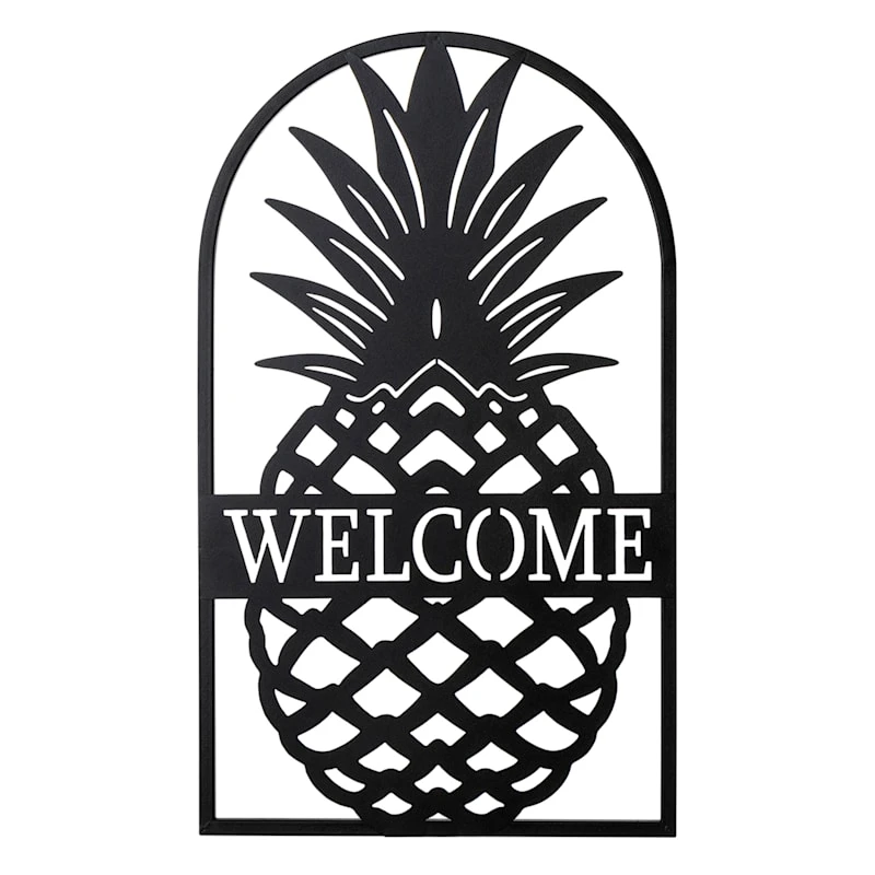 Add a pinch of charm to your garden with our 24in. black metal “Welcome” pineapple wall decor. Created with love, this amazing metal wall plaque features a detailed welcoming pineapple motif. Everyone will enjoy the wonderful welcome. Made of rust-resistant metal, this wall art is designed to greet guests all season long.