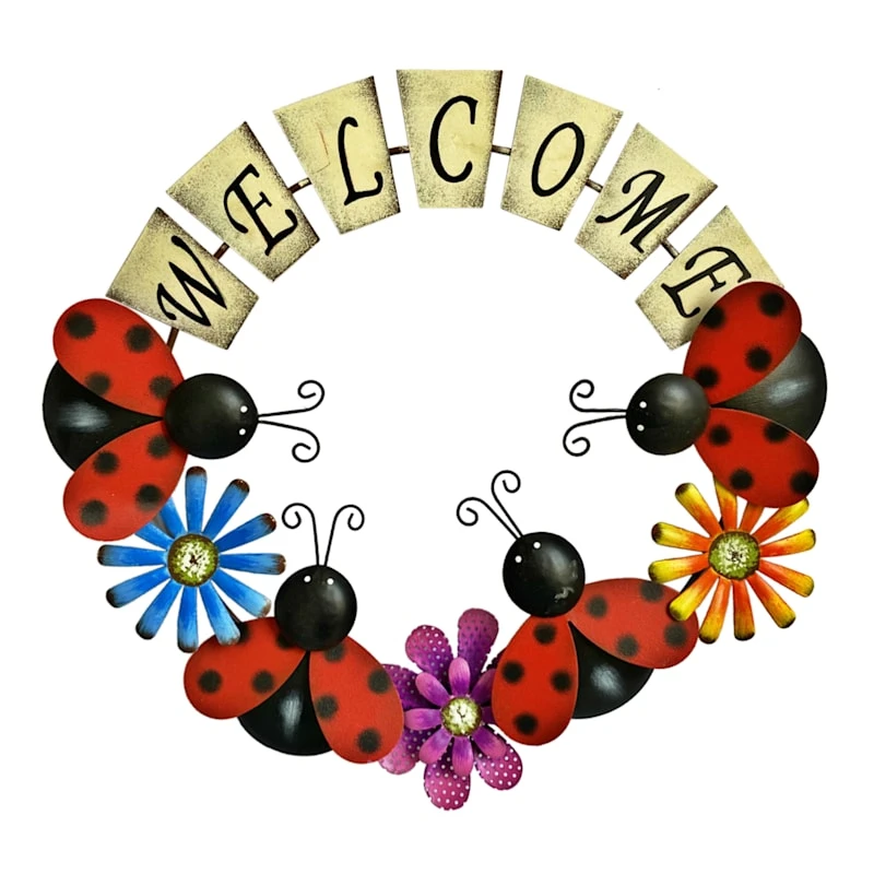 Add a pinch of fun to your garden with our 17in. multicolor metal ladybug and flower “Welcome” wall decor. Created with love, this simple metal wreath features a whimsical flower and ladybug motif. Everyone will enjoy the sweet welcome. Made of rust-resistant metal, this wall art is designed to greet guests all season long.