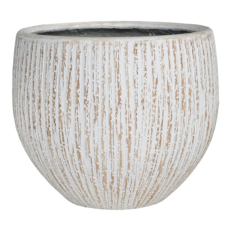 Our wonderfully textured white bark design planter has a white and natural ribbed finish that makes it an amazing contemporary piece. The patina is natural concrete that looks like fossilized bark. Featuring a textured, realistic finish, this pot is a true statement piece. The generous 21x18in. egg-shaped size will house a good number of plants without looking crowded. Ideal for an apartment balcony, entryway or backyard patio. The modern lines and interesting shape of this planter will help maintain a clean design throughout your indoor or outdoor decor.