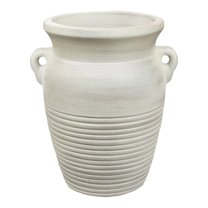 Highlight your green thumb and showcase your annuals and perennials at your front door or add a touch of festive foliage to the deck with our simple yet stylish planter. More than just a spot to display your gardening skills, this wonderful 8.5in. whitewashed handle pot offers a wonderful artistic appearance with its solid rustic white surface, ribbed base and curved rimmed shape. Designed to live indoors or on a covered patio, this clay planter is ready and waiting to make your plants pop.